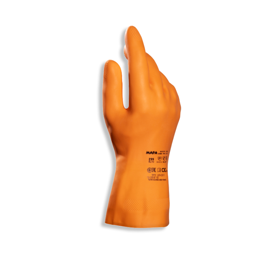 Guanto arancione in lattice naturale ad alto spessore. Finitura interna floccata, finitura esterna zigrinata. Elevata prestazione meccanica per una protezione di lunga durata a contatto e a immersione con prodotti chimici.