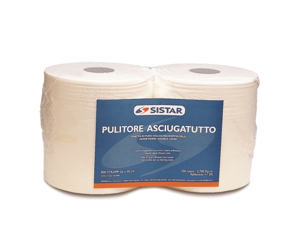 Bobina di carta in pura cellulosa non riciclata, qualità extra, doppio velo. Non contiene sbiancanti ottici. Colore bianco.