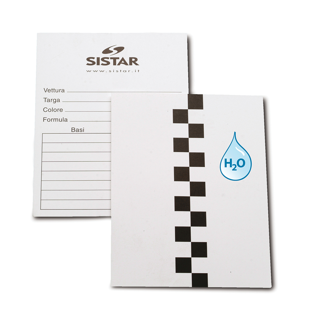 Provatinta in speciale cartoncino trattato con inchiostri che non alterano il colore. Con banda nera a scacchi per il controllo del potere coprente della vernice applicata. La versione per vernici base acqua ha una speciale protezione che evita l’assorbimento dello smalto. Sul retro si possono annotare i dati del veicolo e della formula colore. Formato:100×130 mm.