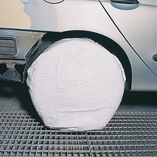 Copriruota in tessuto-non-tessuto Tyvek, con elastico di tenuta lungo tutta la circonferenza. Riutilizzabile.