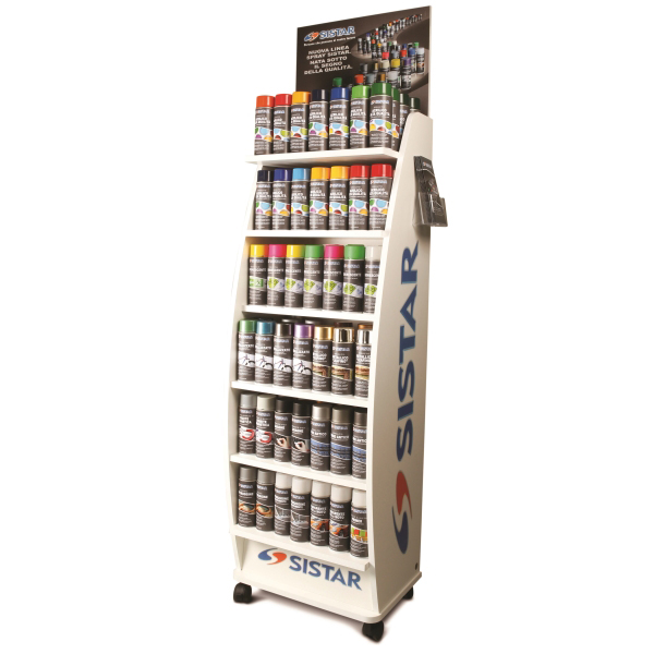 L’espositore viene consegnato in comodato d’uso gratuito ai Rivenditori che trattano la linea Spray Sistar.