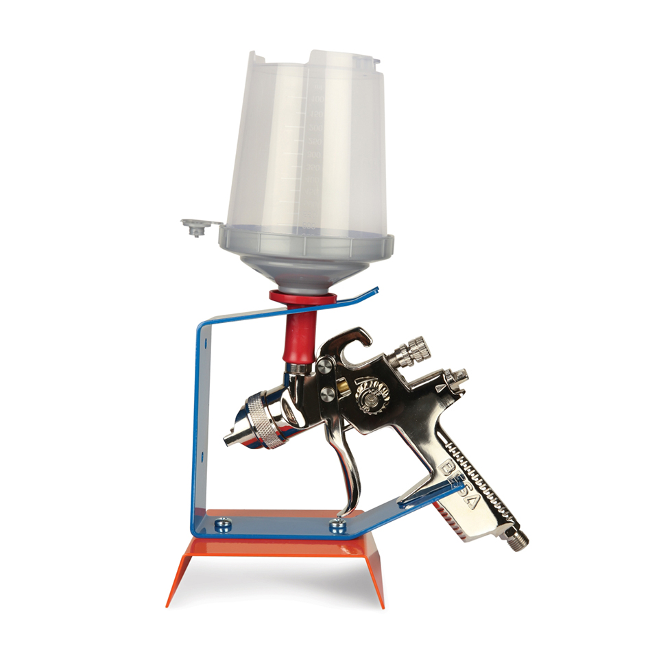 Una volta che la vernice è preparata e miscelata direttamente nel contenitore graduato, si avvita il coperchio conico e tramite un apposito adattatore lo si collega direttamente sulla pistola a spruzzo, con una semplice pressione, al posto della tazza a gravità originale.