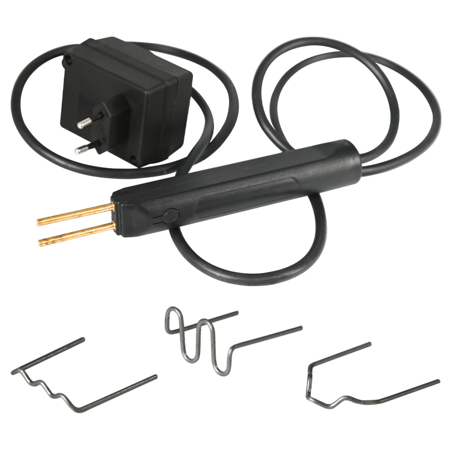 Attrezzo professionale leggero e maneggevole per la saldatura a caldo delle graffette utili nella riparazione di parti in plastica presenti sul veicolo. Il mini applicatore rafforza il punto di giunzione delle parti danneggiate mediante graffette sagomate in acciaio.