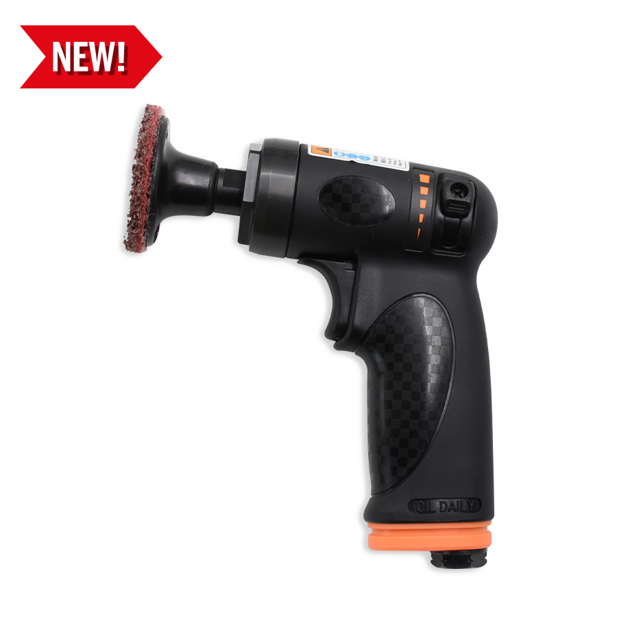 Mini levigatrice angolare rotativa con regolatore di velocità, design compatto e impugnatura ergonomica. Utilizzabile con gli abrasivi attacco rapido tipo R. Completa di platorello Ø 75 mm.