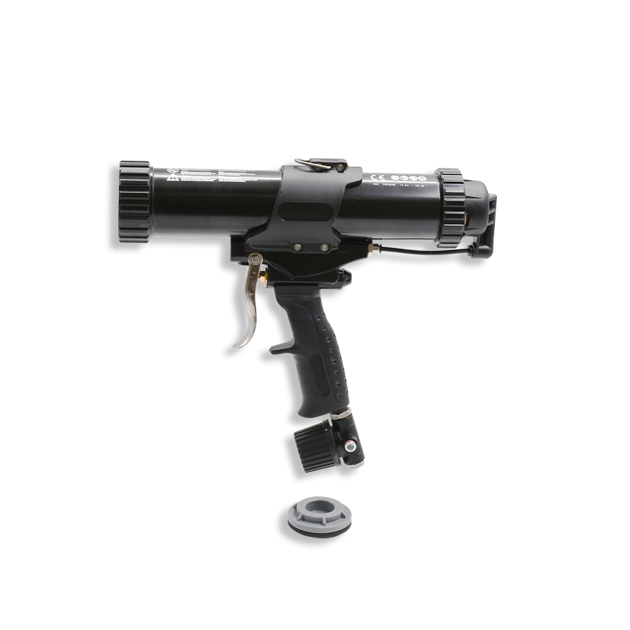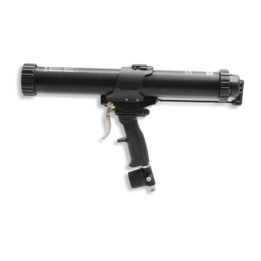 Pistola professionale pneumatica per l’estrusione di sigillanti monocomponenti a media viscosità in cartuccia da 290/310 ml e sacchetto da 300 ml, 400 ml e 600 ml. Completa di regolatore di pressione dell’aria e vari accessori. Pressione di lavoro: 4-8 bar, max. 10 bar. Forza di spinta: 160 Kgf (8 bar).