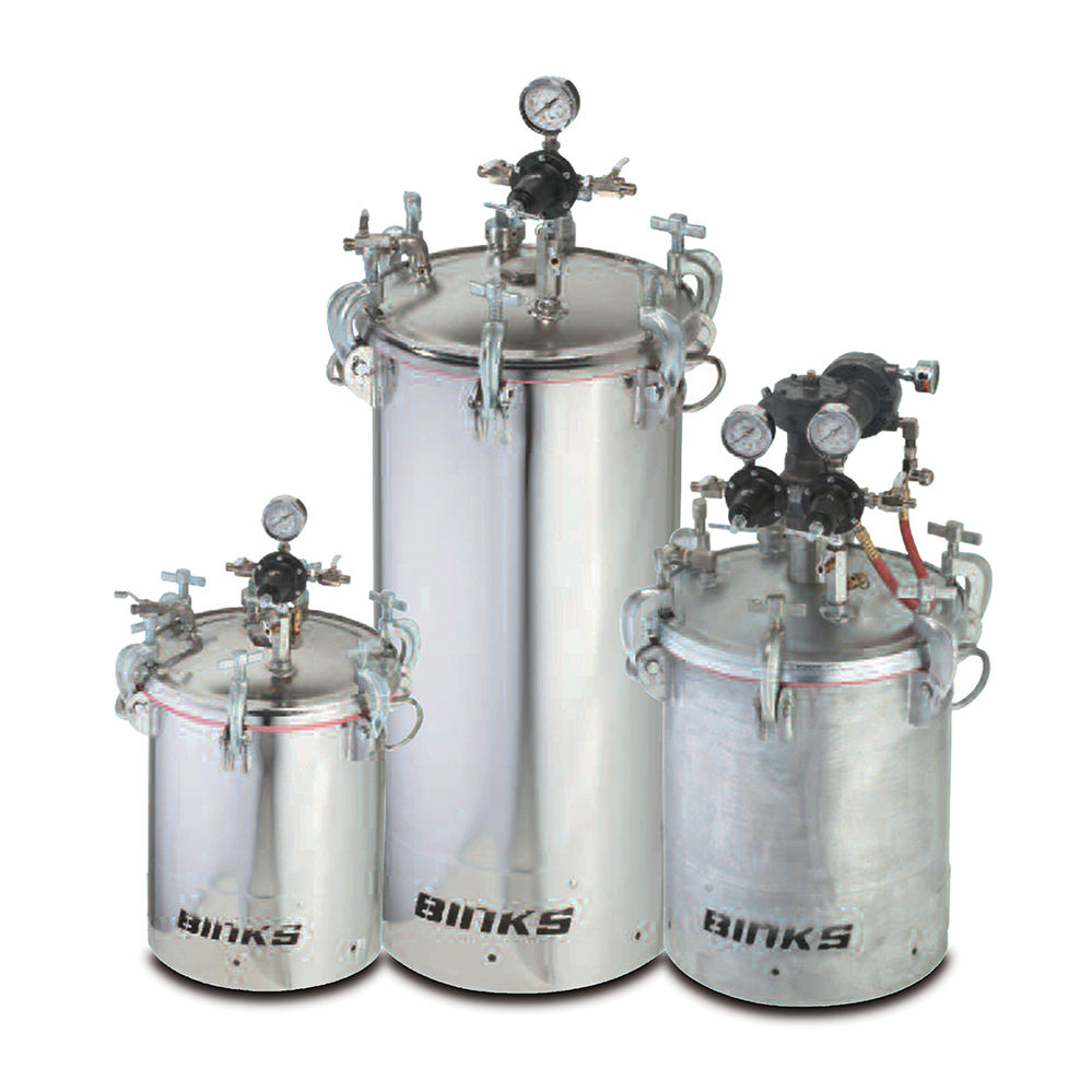 I serbatoi sotto pressione sono utilizzati per preparare quantità di prodotto liquido e di agitarlo continuamente (se necessario) mantenendo la viscosità per una spruzzatura con pressione aria continua. I serbatoi della gamma Binks sono attrezzati con riduttori di pressione di aria (per regolare la pressione di uscita appropriata del prodotto) e con una valvola di sicurezza. Agitatori manuali, rotativi o alternativi sono disponibili per offrire l’agitazione della migliore qualità possibile. I serbatoi sotto pressione Binks sono fabbricati con materiali di alta qualità. Sono integralmente conformi alle regolamentazioni europee e mondiali relativi ai serbatoi sotto pressione compreso PED, ATEX ed ASME. Binks offre un serbatoio sotto pressione adeguato ad ogni applicazione industriale.