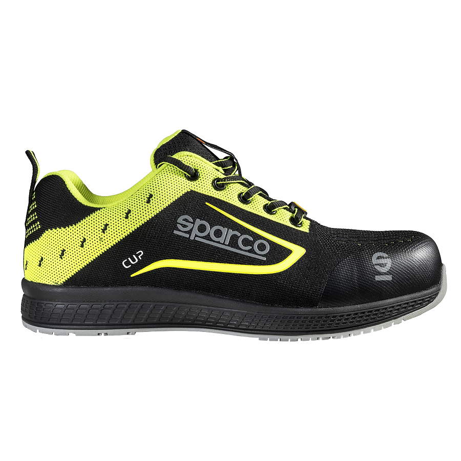 Calzatura di sicurezza bassa Sparco Nurburg S1P SRC, ultraleggera in tessuto jacquard traspirante e rinforzo spalmato sulla punta, ideale per uso indoor.