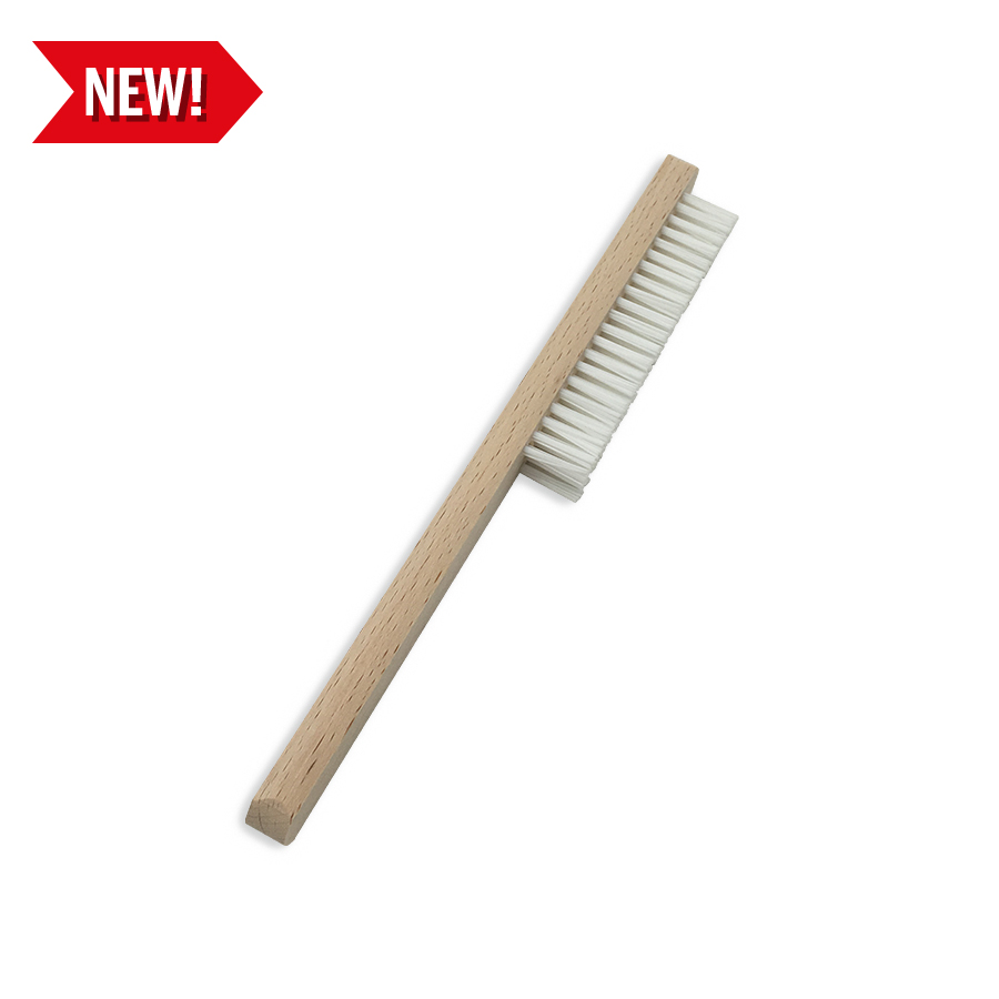 Spazzola con setole in nylon e manico in legno, studiata appositamente per la veloce e perfetta pulizia dei tamponi di spugna e dischi in lana per lucidatura.