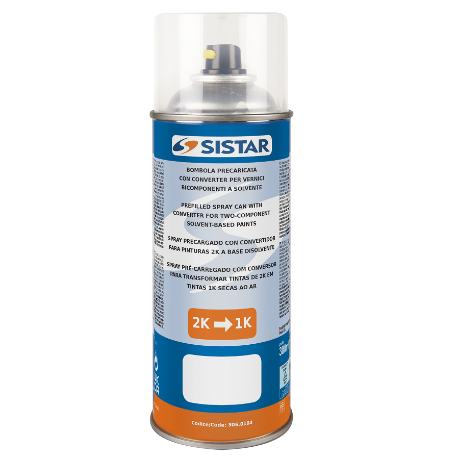 Bombola spray precaricata contenente un convertitore per trasformare gli smalti 2K in smalti 1K essiccabili all’aria.