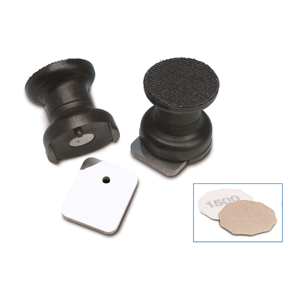 Tamponcino con lato calamitato per usare la lametta rettificata (codice 138.0055) e con lato attacco velcro per usare i mini-dischi Abrasivi (codice 172.0535).