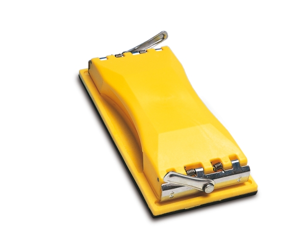 Tampone in plastica per la carteggiatura manuale. Le due molle laterali consentono di bloccare la carta abrasiva non velcrata. Applicando la modifica velcro adesiva 171.0617 lo si può utilizzare anche con carte abrasive velcrate.
