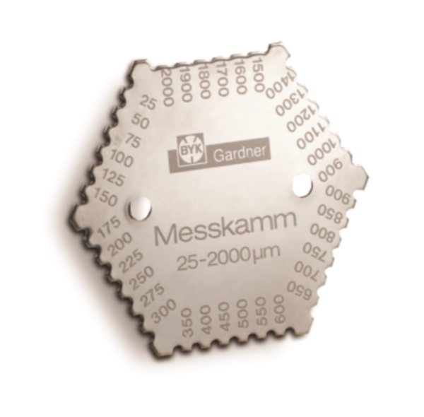 Spessimetro esagonale riutilizzabile in acciaio inox per controllare lo spessore del fi lm di vernice ancora umido.